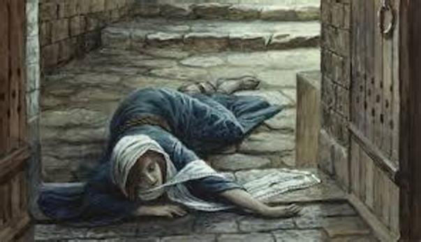 27 And her lord rose up in the morning, and opened the doors of the house, and went out to go his way; and, behold, the woman his concubine was fallen down at the door of the house, with her hands upon the threshold.